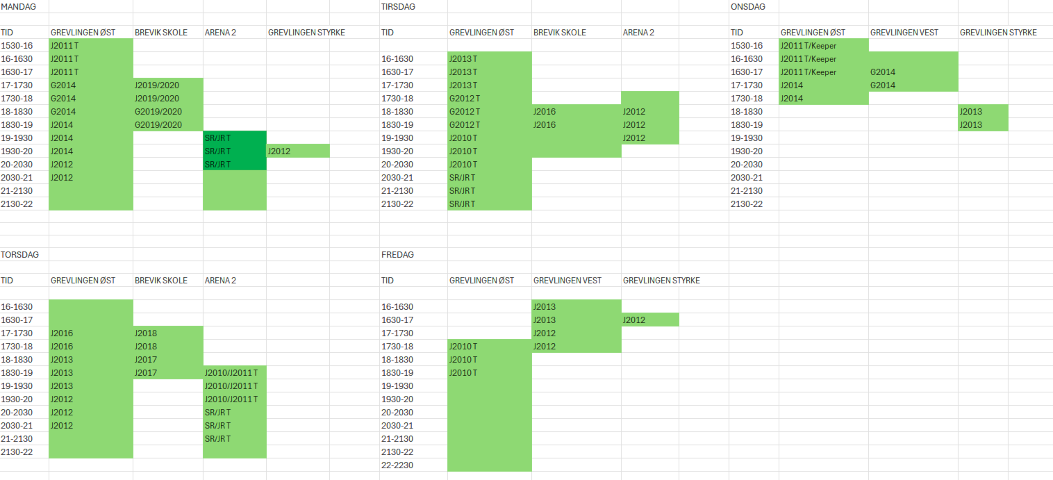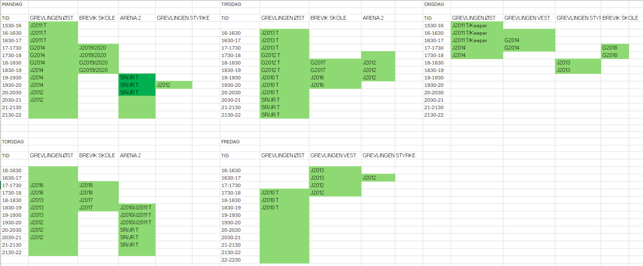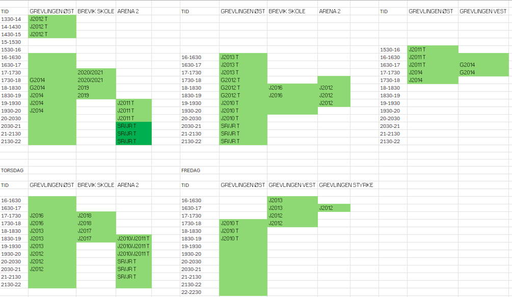 | Time | Grevlingen Øst | Brevik Skole | Arena 2 |